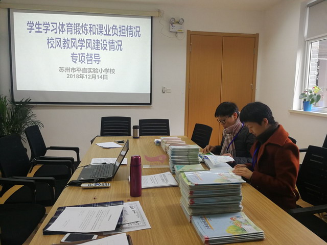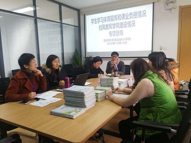 两位督学首先认真听取了董晨校长关于学生学习体育锻炼和课业负担情况、校风教风学风建设情况的工作汇报;接着,两位督导深入课堂听了一节青年教师于沁执教的音乐课《雷鸣电闪波尔卡》,对学校在这两方面工作进行了教师访谈与记录。随后,教导处主任陆虹向两位督学汇报了学校在减负增校方面中的具体做法、采取的措施以及实效,还带领两位督导巡视了校园,检查了低中高各一个班级的不同学科作业,有语文、数学、英语、美术等。两位督学还发给学校一份《关于对平直实验小学2018办学满意度情况进行家长与学生网络问卷调查的通知》,要求学校家长、学生全覆盖网络问卷调查,全面充分了解学校工作。两位督学用半天的时间全面了解了学校学生学习体育锻炼和课业负担情况、校风教风学风建设情况,最后还向学校进行了反馈与指导。