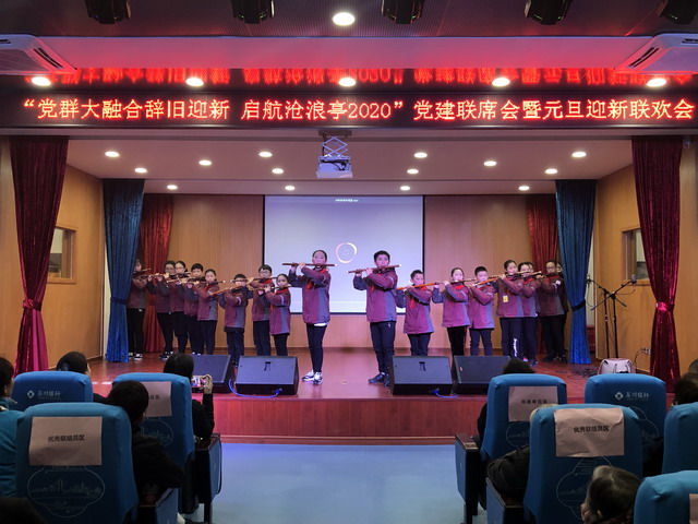 2019年12月27日下午,由双塔街道沧浪亭社区党委主办的“党群大融合辞旧迎新 启航沧浪亭2020”党建联席会暨元旦迎新联欢会在苏州市工人文化宫隆重举行。万彩网100线路作为辖区内的共建单位,20名师生代表参加了此次活动,并上台表演了笛子合奏《我和我的祖国》。小笛手们的精彩演出获得了在场观众的热烈掌声。