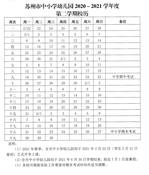 新学期好!接上级通知,2020~2021学年度第二学期学生于2月21日开始报到,2月22日正式开学上课。本学期于2021年6月30日结束,拟定7月1日放暑假。