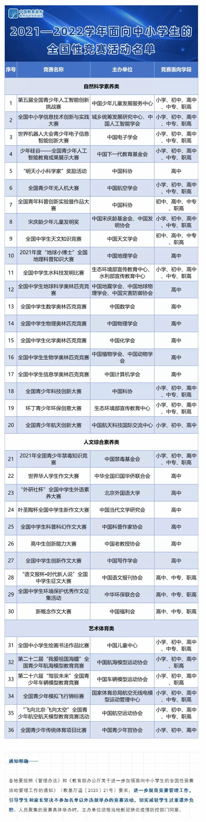 36项!教育部公布中小学全国性竞赛活动名单
