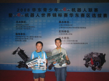 本次比赛前,组委会曾多次对比赛器材要求及比赛规则作了修改,我在最短的时间内,本着高效节约的原则,对机器作了有效改装,以适应比赛要求。本次比赛采用国际规则,即采用联赛制,这就要求各个队伍、各位队员必须要有强烈的合作意识和合作能力,在随机配队时,所有的比赛,与我们组队的都是来自其他地区的队伍。我们参加的四场比赛中,与我们合作的安徽合肥队比赛时机器出现故障,凭着我们一辆车对抗对方两辆车,虽然我们的队员徐臻青同学在自动、遥控操作两方面都发挥正常,但最后还是输了这场比赛。