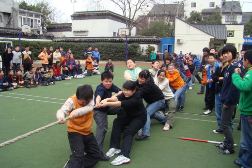 同学们早已摩拳擦掌、跃跃欲试,谁也不想输掉这次拔河比赛。队员们手握大绳,摆好架势,随着一声哨响比赛正式开始。拉拉队们扯开嗓子喊叫着: “加油,加油!”参赛队员更是卯足了劲拉着,脸憋红了、手磨疼了,仍然坚持。每个人都在为班级荣誉而战,比赛的激情使老师们也全身心地高声呐喊着。