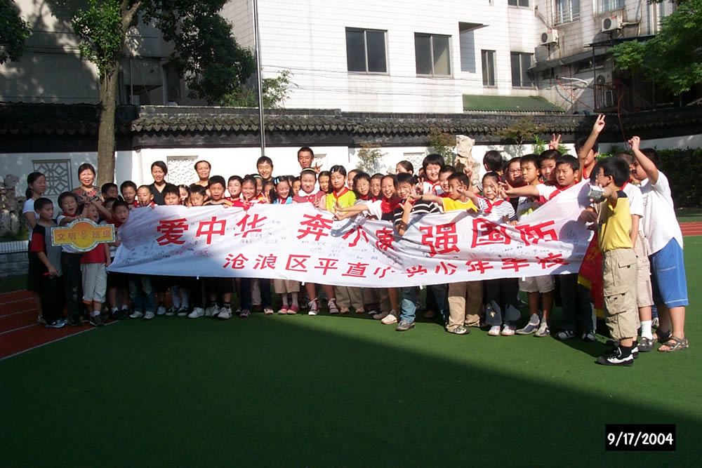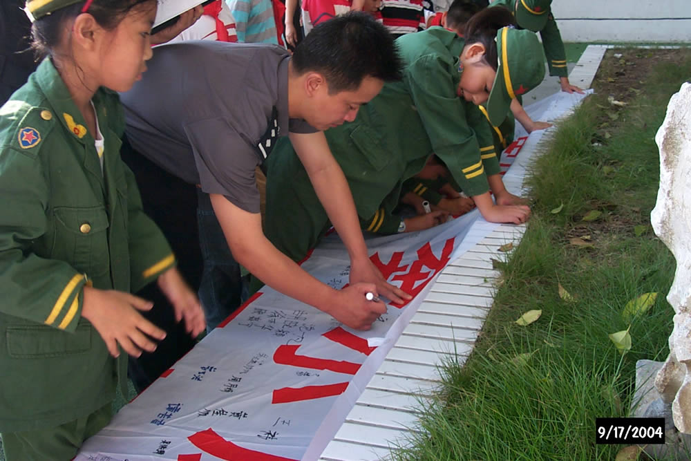 激情澎湃的同学们在接下来的签名活动中,更是踊跃表决心。在一幅长5.5米,象征着中华人民共和国成立55周年的写有“爱中华,奔小康,强国防”的横幅上,一只只小手有力地写下了自己的名字,横幅表达着我校全体学生不忘国耻,热爱祖国,保卫祖国的决心。从今天起,他们心中又涌动着一股力量,一种信念——“爱我中华,强我国防” !