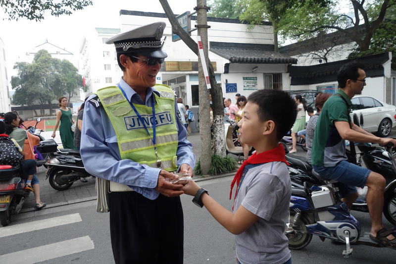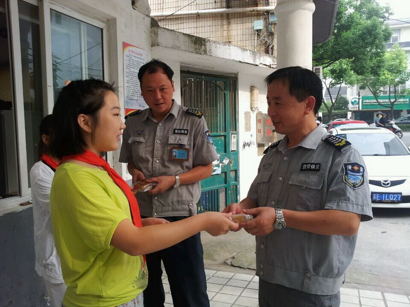 在美丽的校园里,有那么一群可爱的人,默默地奉献着:保安叔叔,每天在上下学最拥挤的时候,为我们疏散人群;保洁阿姨,一层又一层,一遍又一遍,扫地擦窗,给我整洁明亮的校园;送饭伯伯;头顶烈日,午餐前一盒盒热腾腾的饭菜送到教室里,为我们准备可口的午饭。中秋佳节来临之际,万彩网100线路大队部组织学校大队委来到这些工作在最平凡岗位上的可爱可敬的人们身边,送上诚挚的祝福。