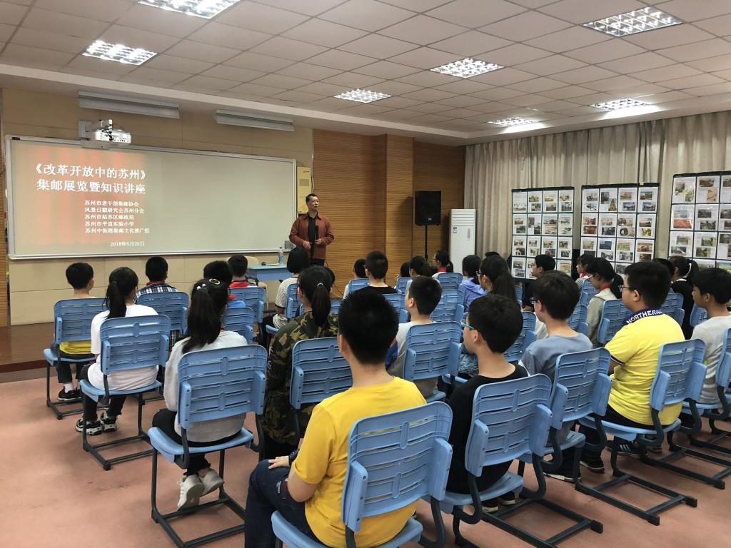 5月25日,姑苏区邮政局联合苏州市老干部集邮协会、风景戳研究会苏州分会,来到苏州市平直实验小学,利用班会课时间为六年级的同学们开展了一场生动形象的《庆祝改革开放40周年》集邮展览暨知识讲座。