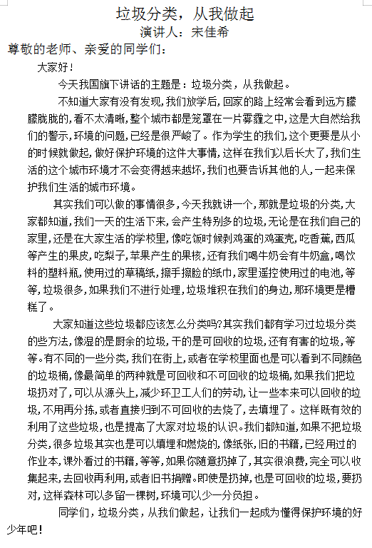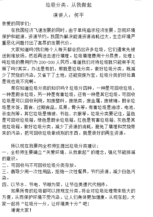 为进一步推进学校垃圾分类工作,提升师生对垃圾分类知识的认识,培养环保、低碳的生活方式。9月21日,学校党员教师代表何平老师、宋佳希老师向全校学生做了《垃圾分类,从我做起》的国旗下宣讲活动。让学生们更详细、全面地了解垃圾分类。