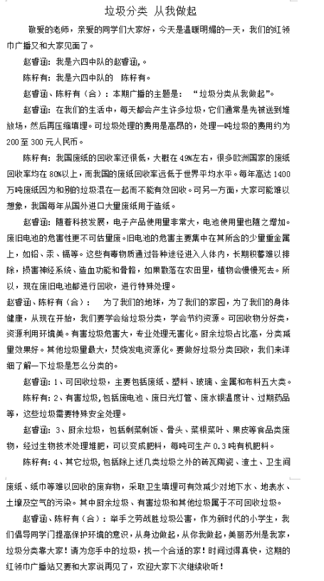 少先队代表们,也利用学校的红领巾广播向全校学生进行垃圾分类知识普及。学会垃圾分类,为保护环境出一份力量。