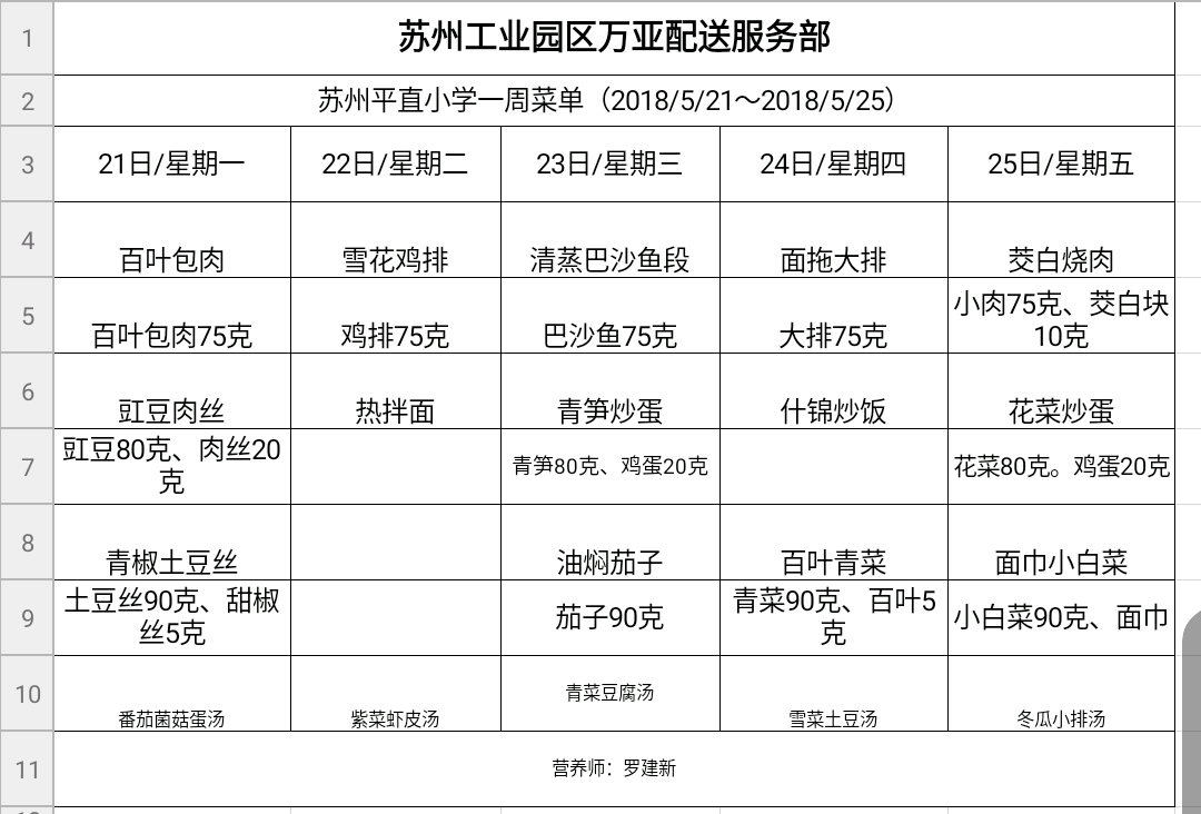 学校2017~2018学年度第二学期第13周菜单