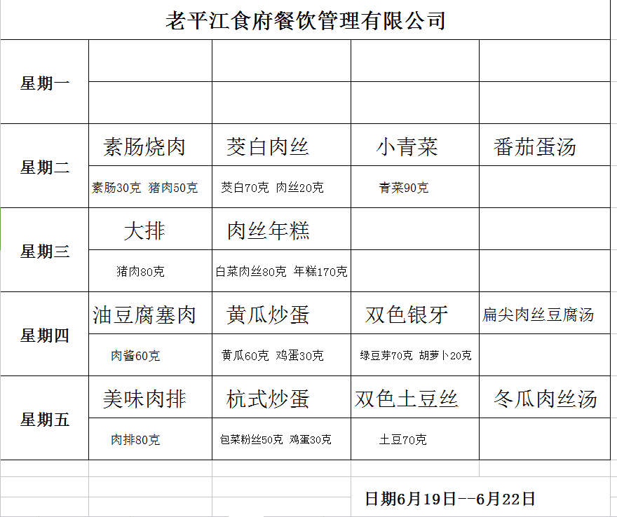 学校2017~2018学年度第二学期第16周菜单