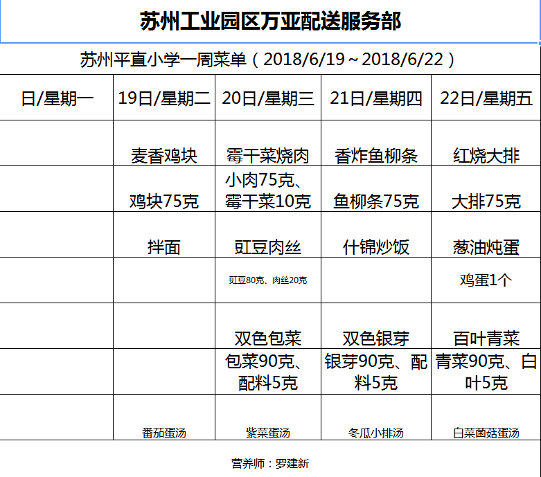学校2018~2019学年度第一学期第1周菜单