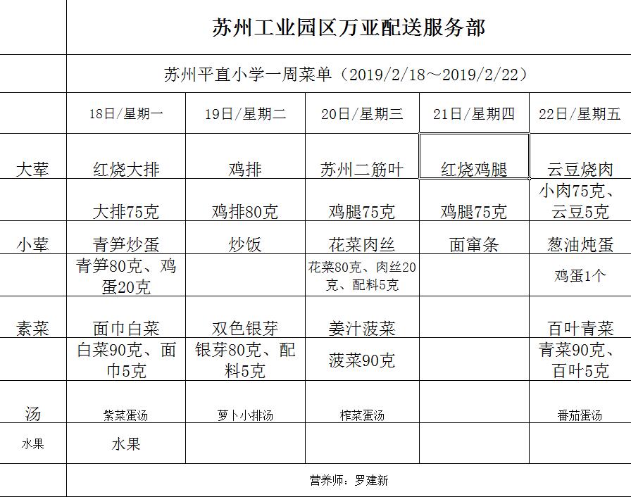 学校2018~2019学年度第一学期第20周菜单