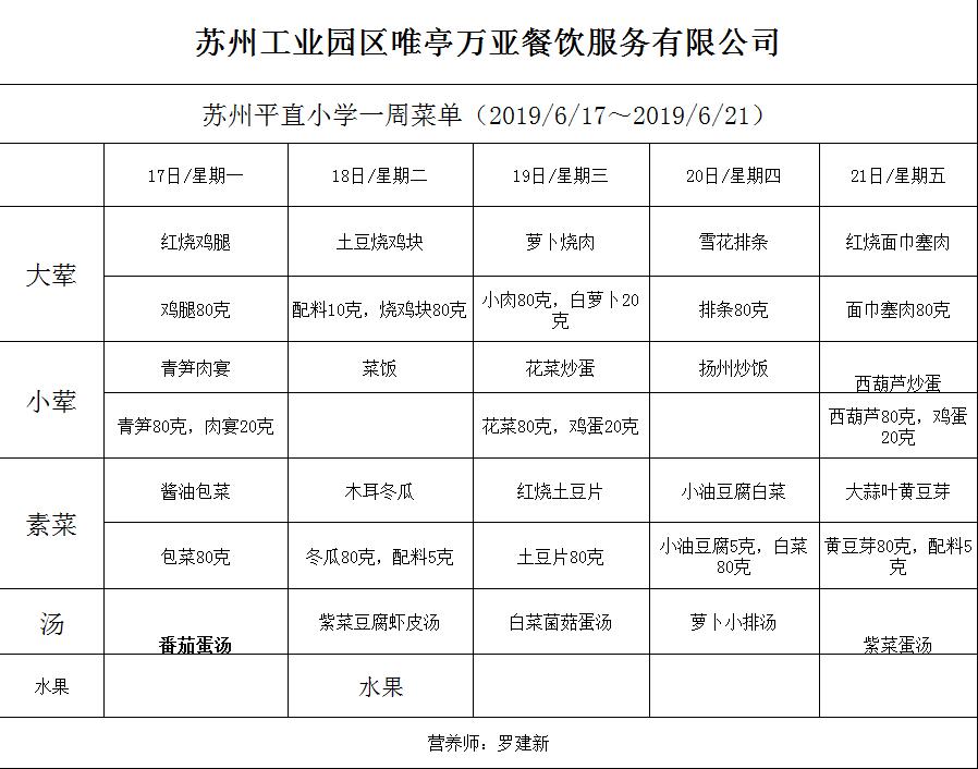学校2018~2019学年度第二学期第17周菜单