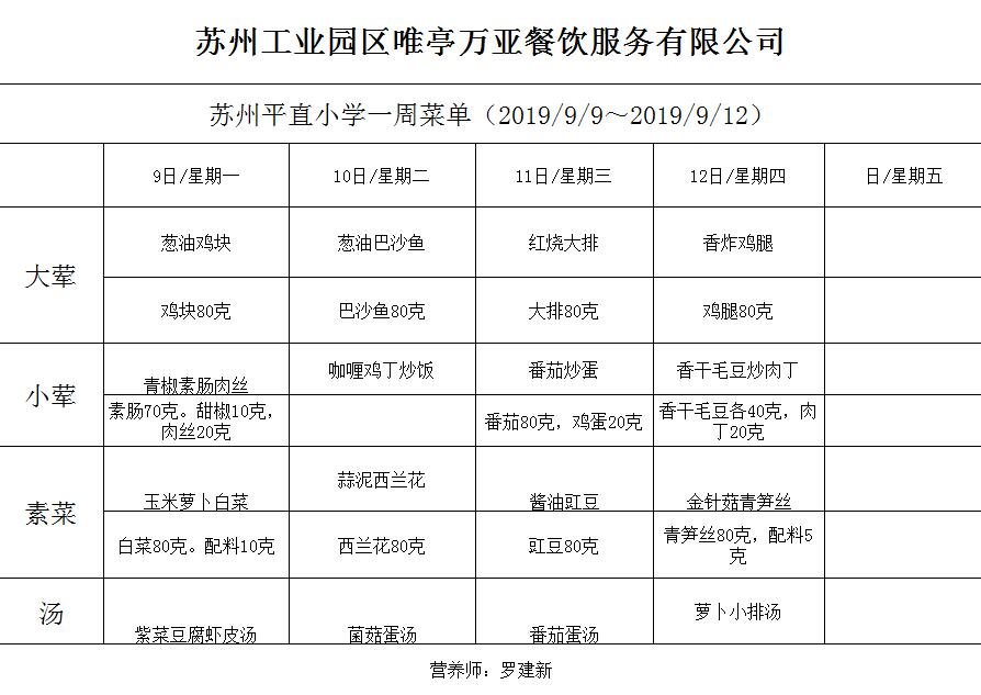 学校2019~2020学年度第一学期第1周菜单