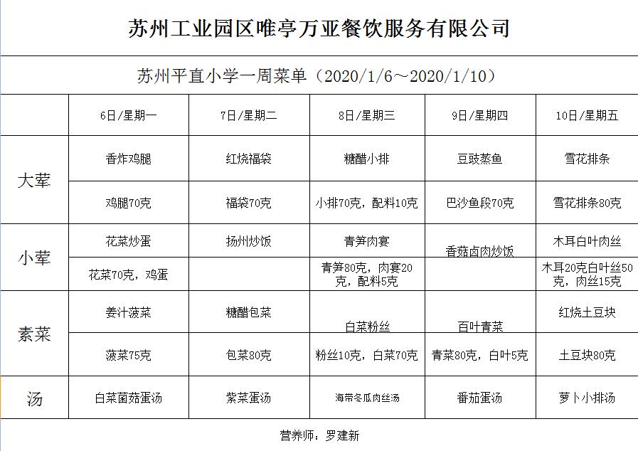 学校2019~2020学年度第一学期第18周菜单