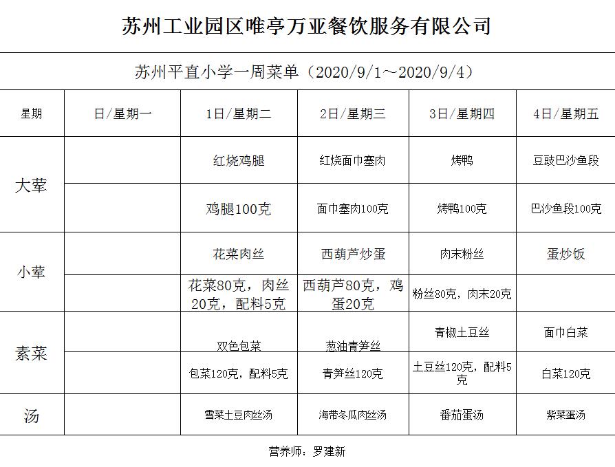 学校2020~2021学年度第一学期第1周菜单