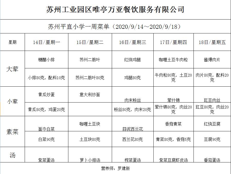 学校2020~2021学年度第一学期第4周菜单
