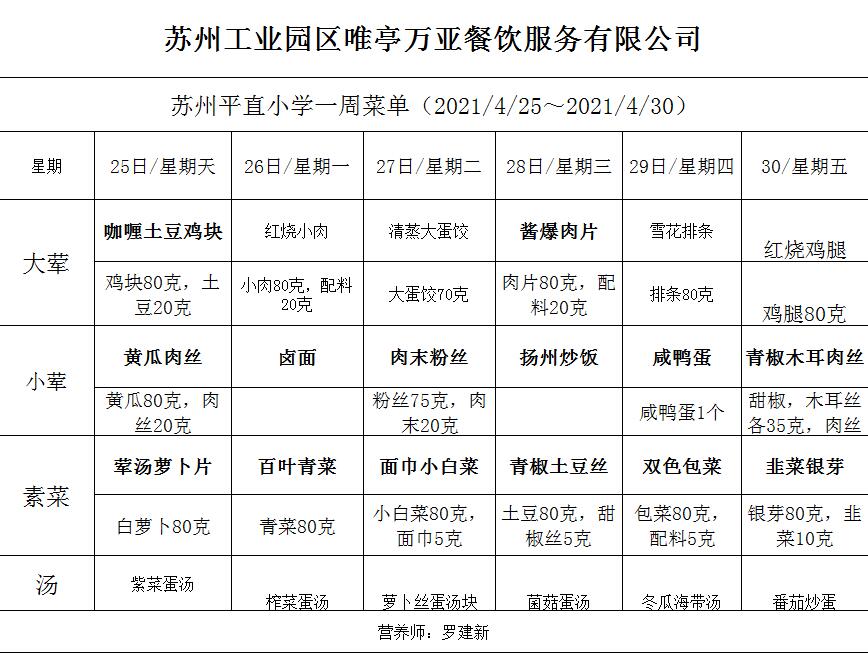 学校2020~2021学年度第二学期第11周菜单