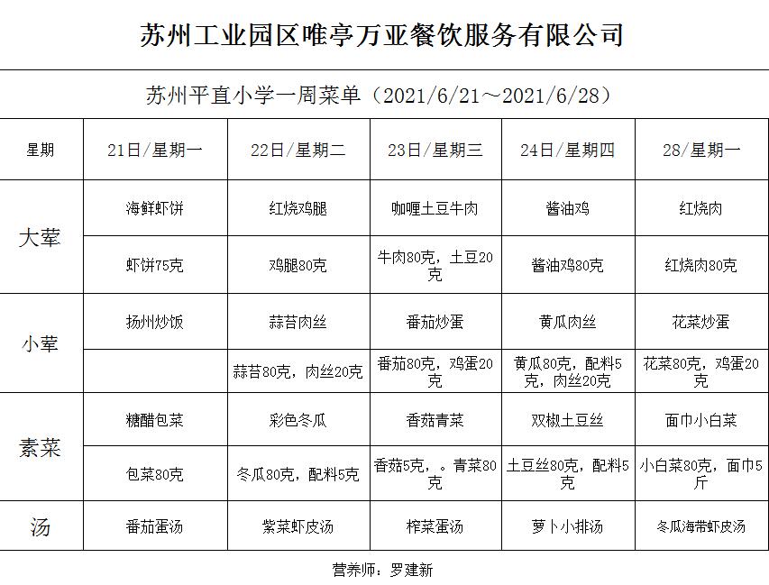 学校2020~2021学年度第二学期第18周菜单