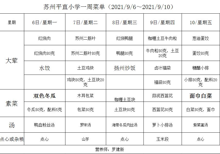 学校2021~2022学年度第一学期第2周菜单