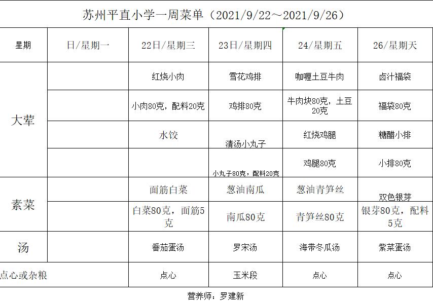 学校2021~2022学年度第一学期第4周菜单