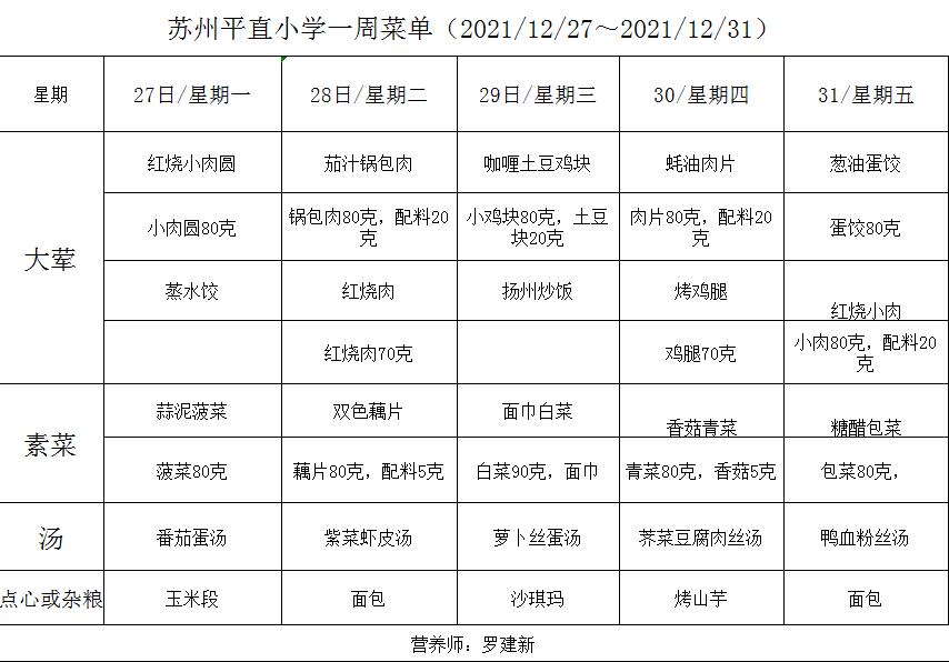学校2021~2022学年度第一学期第18周菜单