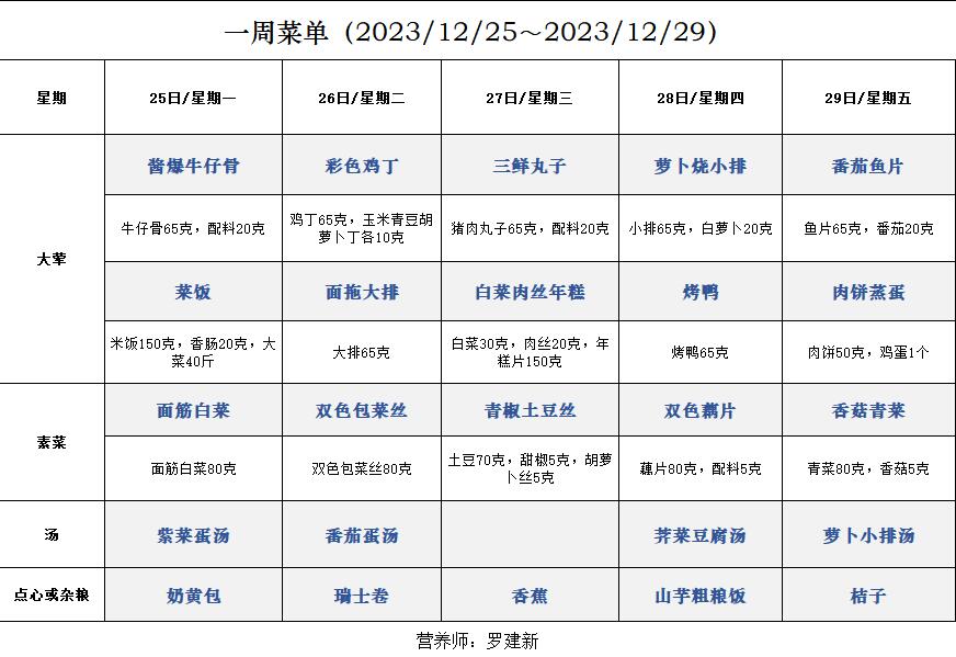 一周菜单(2023/12/25~2023/12/29)