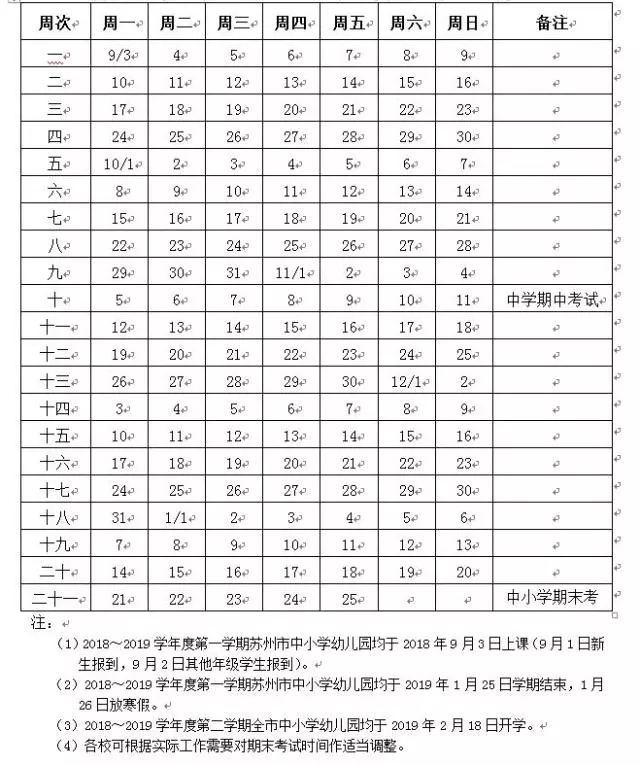 苏州市中小学2018~2019学年度第一学期校历