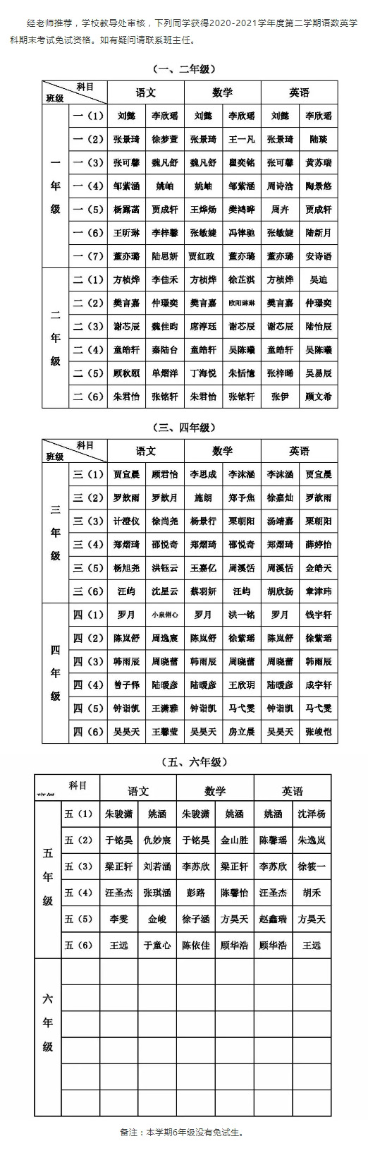 学校2020_2021年度第二学期语数英学科免试生名单公示