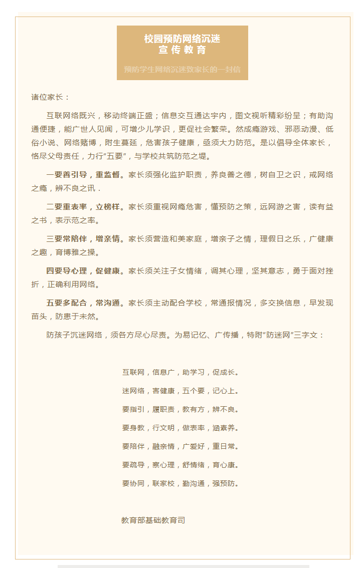 预防学生网络沉迷致家长的一封信