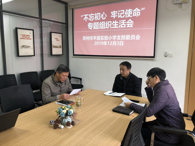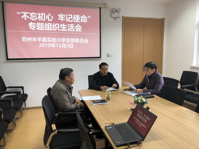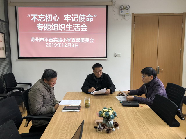 2019年12月3日,根据姑苏教发2019年18号关于“不忘初心 、牢记使命”主题教育专题组织生活会的工作要求,苏州市平直实验小学支部委员会召开民主生活会,三位支委成员认真对照检查,查摆了自己在政治、思想、作风、能力、清正廉洁五个方面存在的突出问题,并就产生问题的原因进行了深刻剖析,还各自提出了整改措施。